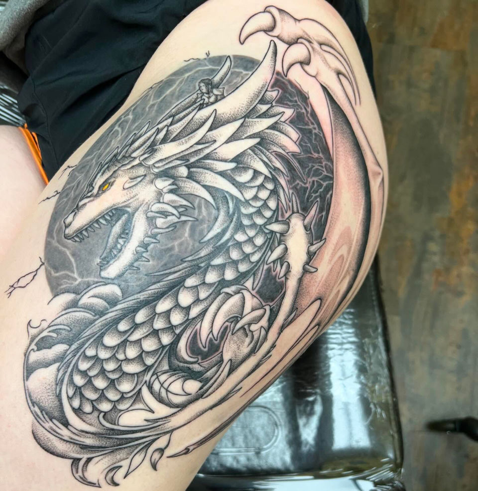 Hi, my name is Thom. I have been tattooing altogether about 5 years now. My favorite style of tattoo would be split between black and grey (no portraits yet) and American traditional. I love the bold lines and color on traditional tattoos but also love the depth you can achieve with just using black pigments. I would love to gravitate towards more black and grey floral work but will never turn down a good traditional tattoo. I also love doing little script tattoos. My favorite script tattoos are memorial script tattoos of the persons actual handwriting. Those seem to bring the most joy to the clients. Outside of work I’m still a big art nerd. I love to paint with watercolors or oil paints. I will occasionally play a round or twelve of disc golf. Usually most of my time is dedicated to my family.